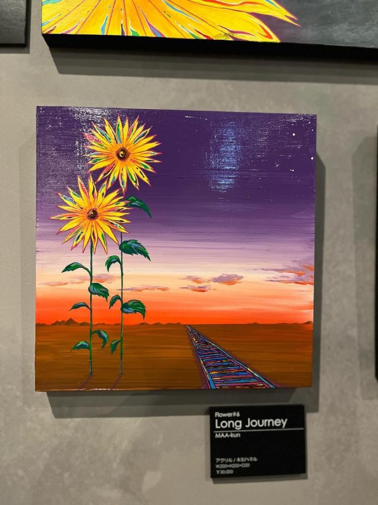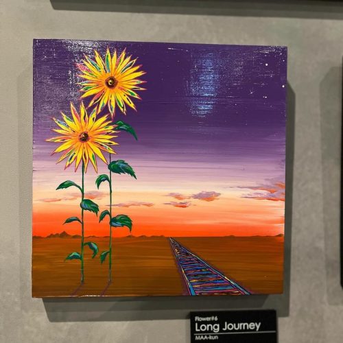 The flowers bloomed on a long journey, like a train track that continues on forever. Rather than just continuing on, it might be good to stop sometimes and look for interesting scenery and encounters. I wanted to create a piece that would make people think and feel excited about the detours they might take.