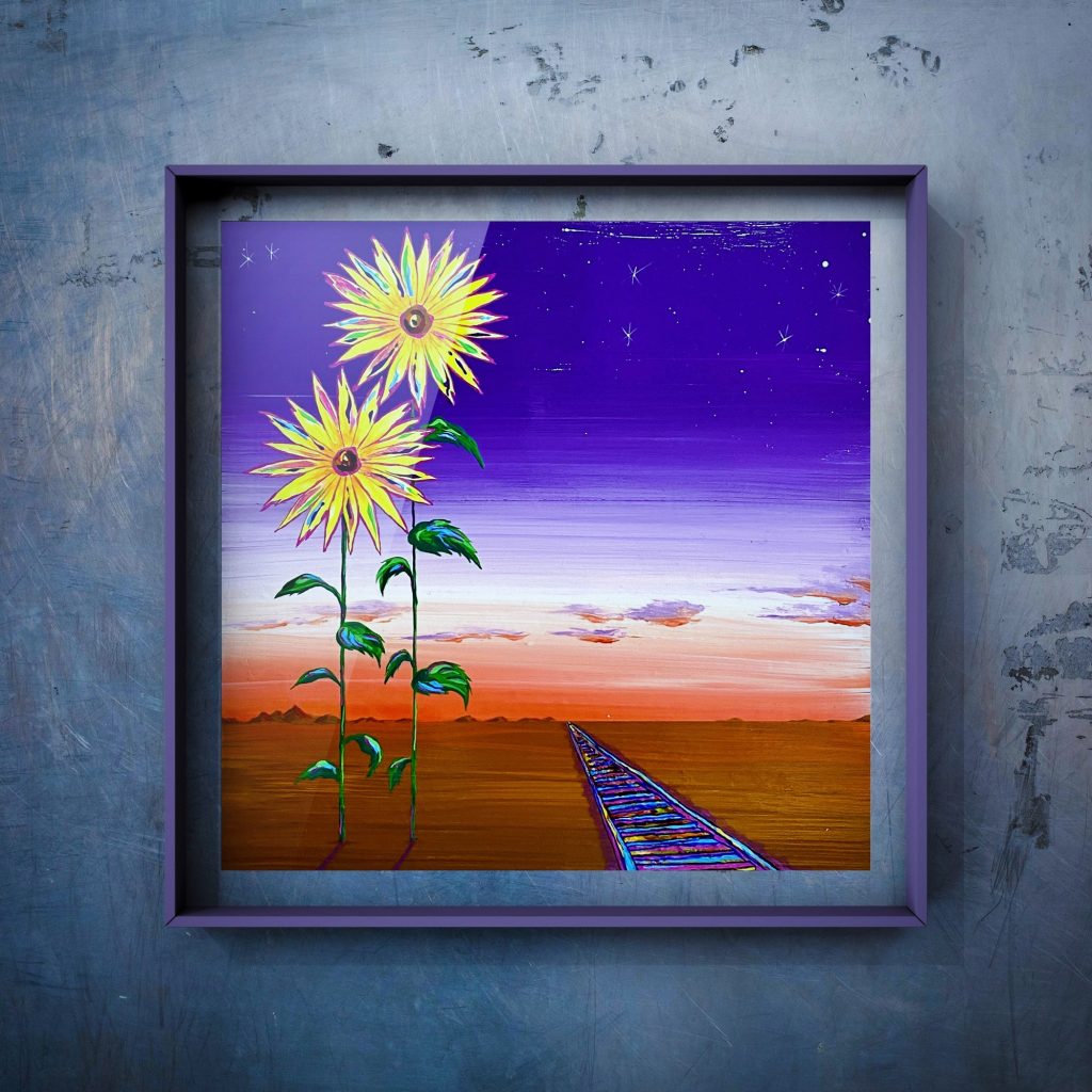 どこまでも続く線路のような長い旅路の途中に花を咲かせました。ひたすら進み続けるのではなく、時には立ち止まって楽しい景色や出来事との出会いをさがすのもいいかもしれない。どんな寄り道をするかわくわくしながら考えることができる一枚にしたいという願いを込めました。