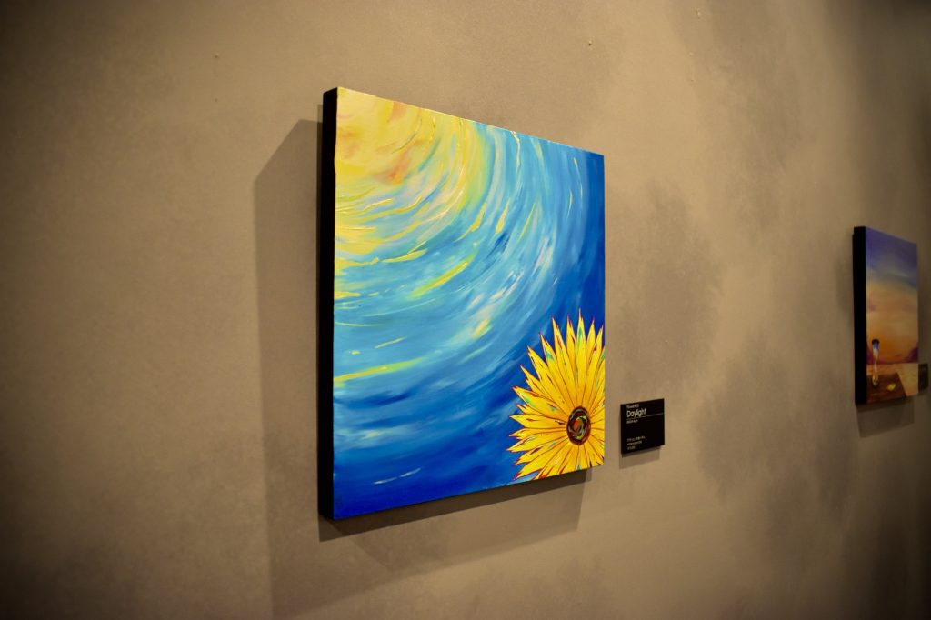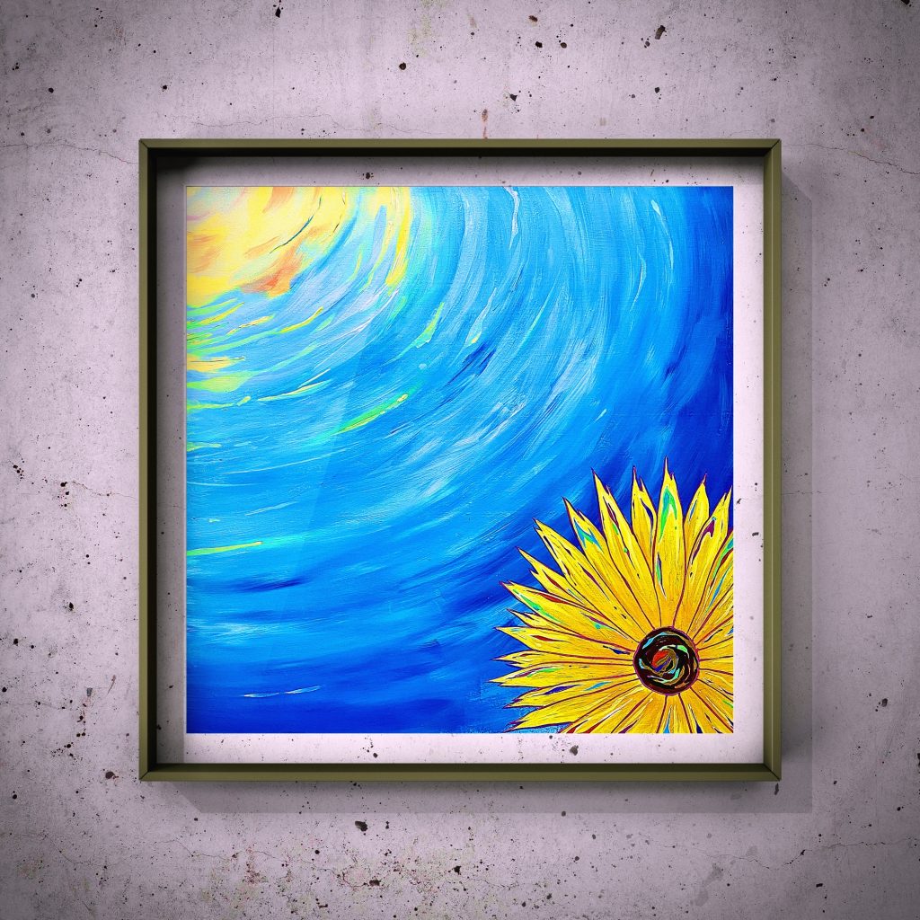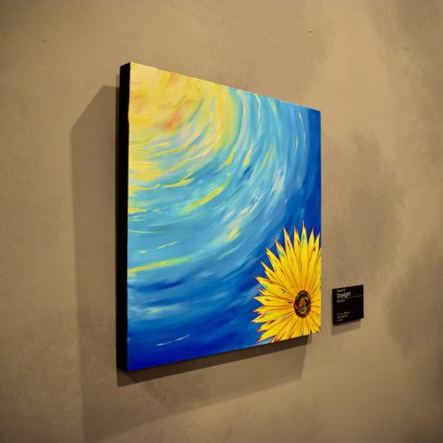 A flower looks up from the depths of the sea at the sun shining high in the sky. This piece expresses the gentle relationship between the flower yearning for the sun and the sun bringing its gentle rays of sunlight to the flower.