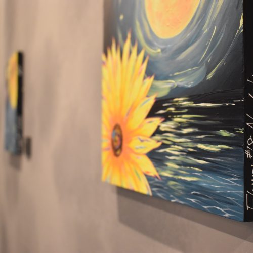 The moonlight and colorful flowers transform the pitch black sea into a beautiful landscape. This piece asserts that with light and color, darkness can be erased and a beautiful world can be created.