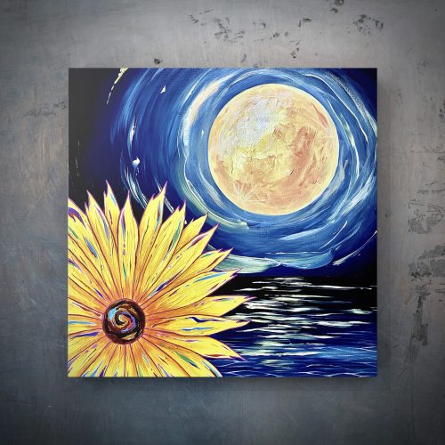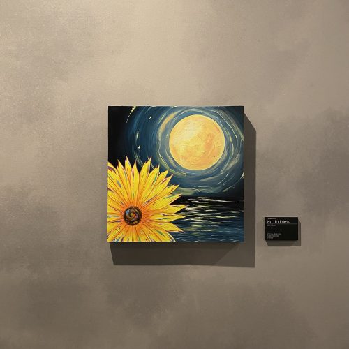 真っ暗な海の暗闇を月の光と花の彩が美しい景色に変えてくれる。光と彩さえあれば、暗闇を消すことができる、美しい世界に創り変えることができることを主張する一枚。