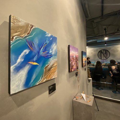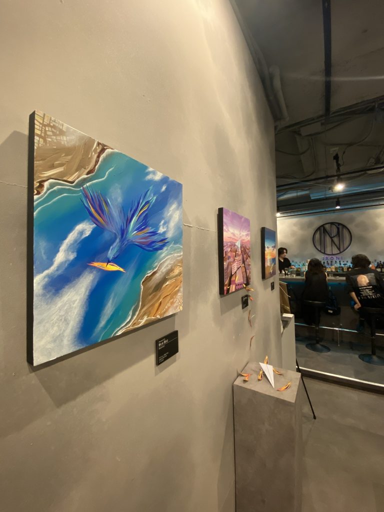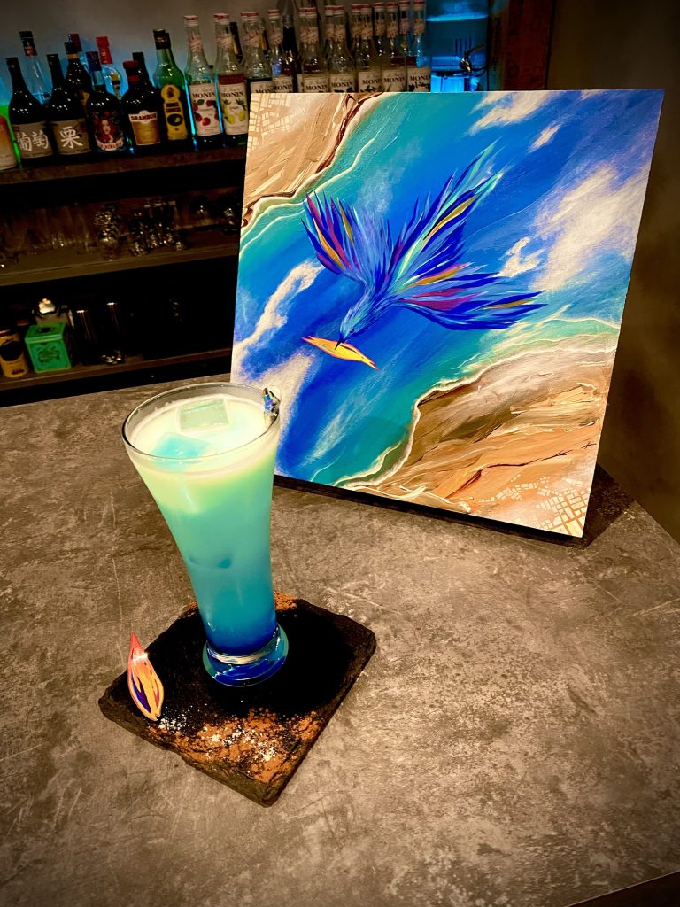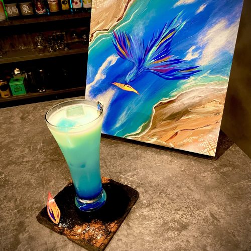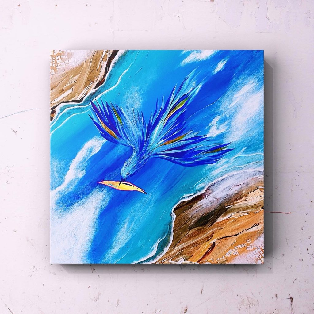 It is a piece that depicts a blue bird flying high in the sky. Even today, she’s flying around the world to bring happiness to someone.