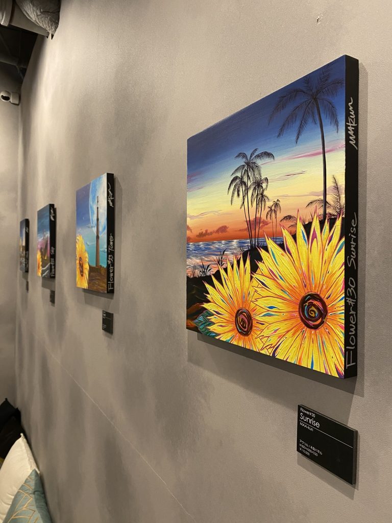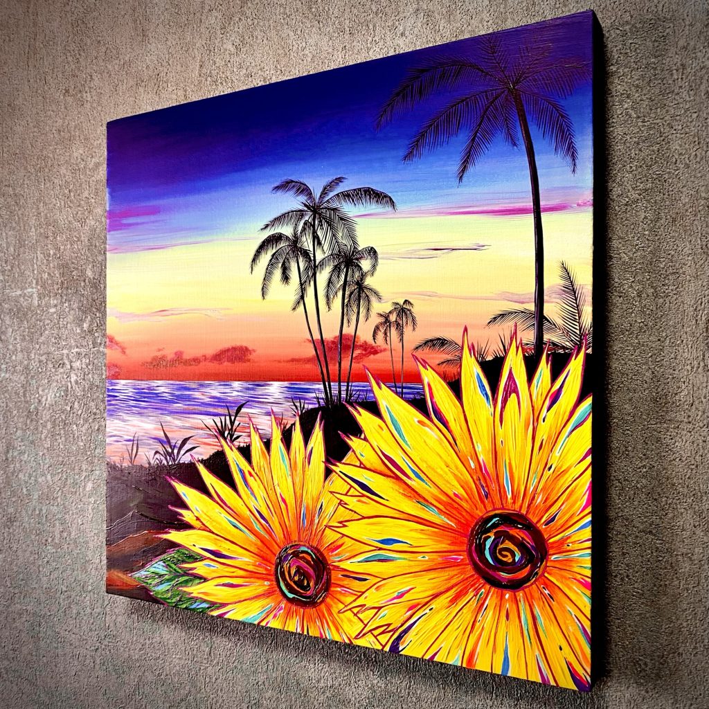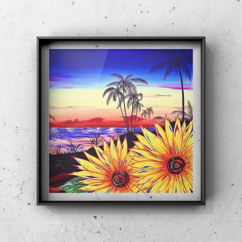 南の島で見た世界を描いた一枚。夜明けの空のグラデーションとともに鮮やかに咲く花は、新しい何かの始まりを象徴しています。